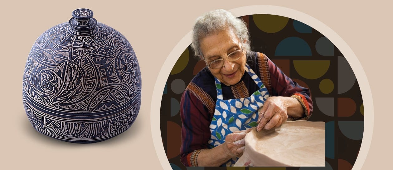 Ira is a studio potter and ceramic artist who lives in Delhi and grew up with educationalist parents in Tagore’s Visva Bharati, Santiniketan in West Bengal, where she studied art. Her husband was the world-renowned sculptor Sankho Chaudhuri. From 1951, at the newly founded Faculty of Fine Arts in Baroda, she spent her time learning pottery and experimenting with oxides as fired coloring agents, and thus began a prolific career marked by numerous exhibitions and a transformative impact on Indian pottery. Even today, at 93, her zest for life is unmatched.