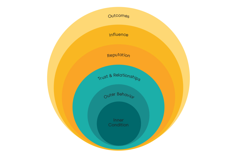 This figure shows ‘The Heartful Leader’ framework. Our inner condition results in outer behaviors, the perception of these behaviors results in good or bad relationships, as well as trust or mistrust. Relationships and trust result in a reputation over the medium to long term, which in turn leads to influence and consequently outcomes.